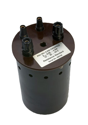 | Manganin or Zeranin depending on the value. 100 ohm, 1, 10 and 100 kilo ohm low inductance winding on brass formers with PTFE insulation. 0.1, 1 and 10 ohm bifilar winding on cylindrical brass formers with PTFE insulation. 0.01, 0.001, and 0.0001 ohm resistance material in the form of straight rods or loops supported on 12mm brass conductors | Each standard is fitted with a label that describes its characteristic and operating parameters | |